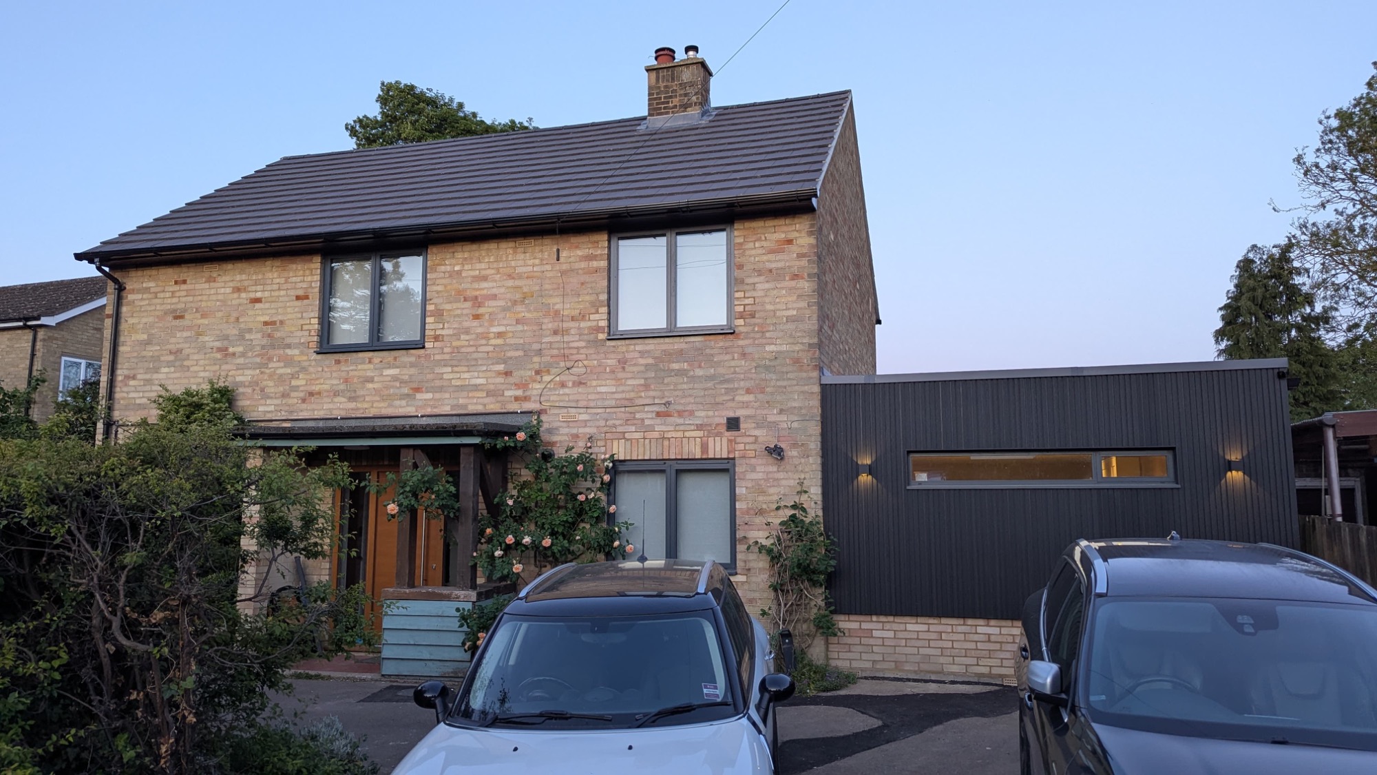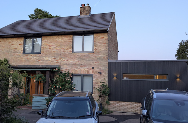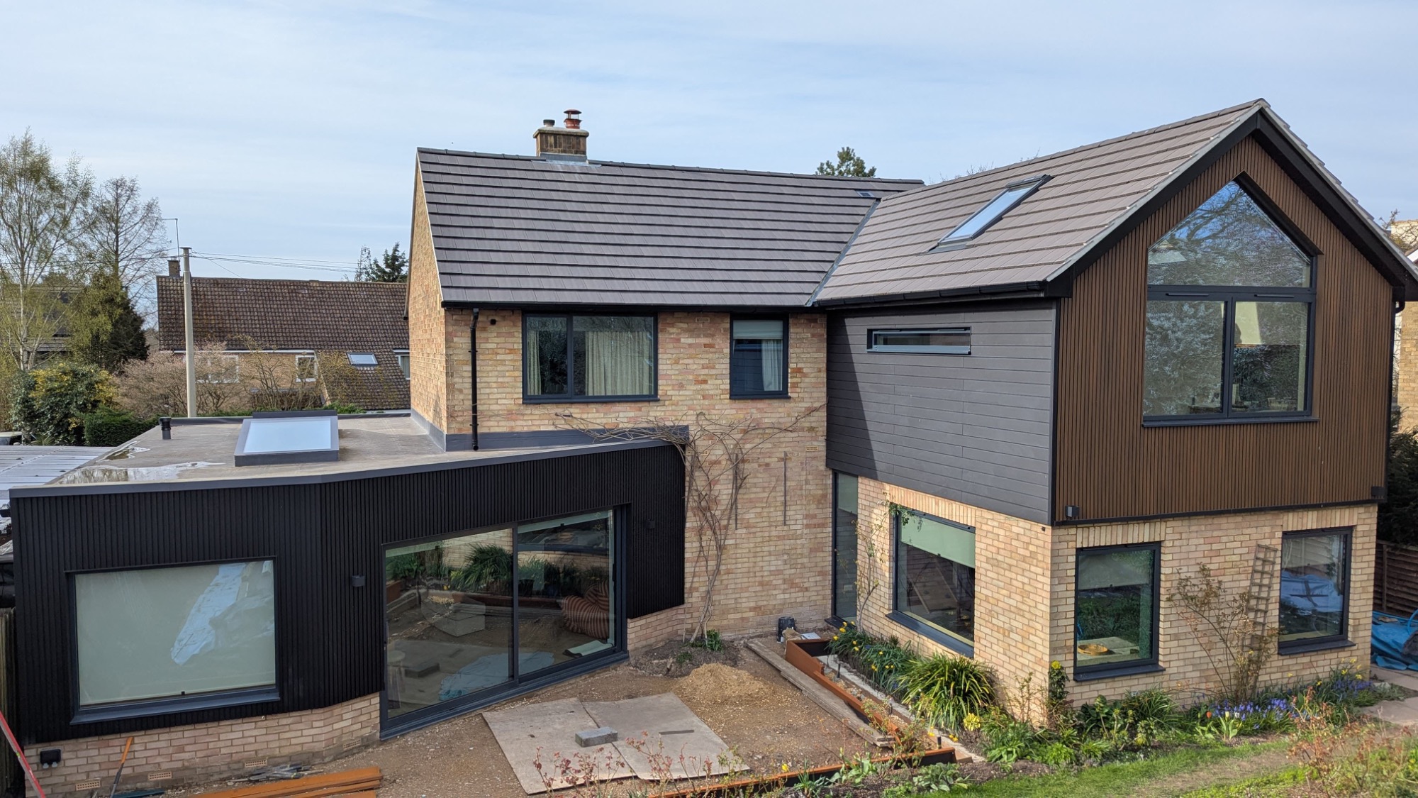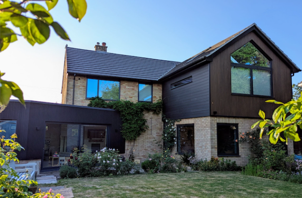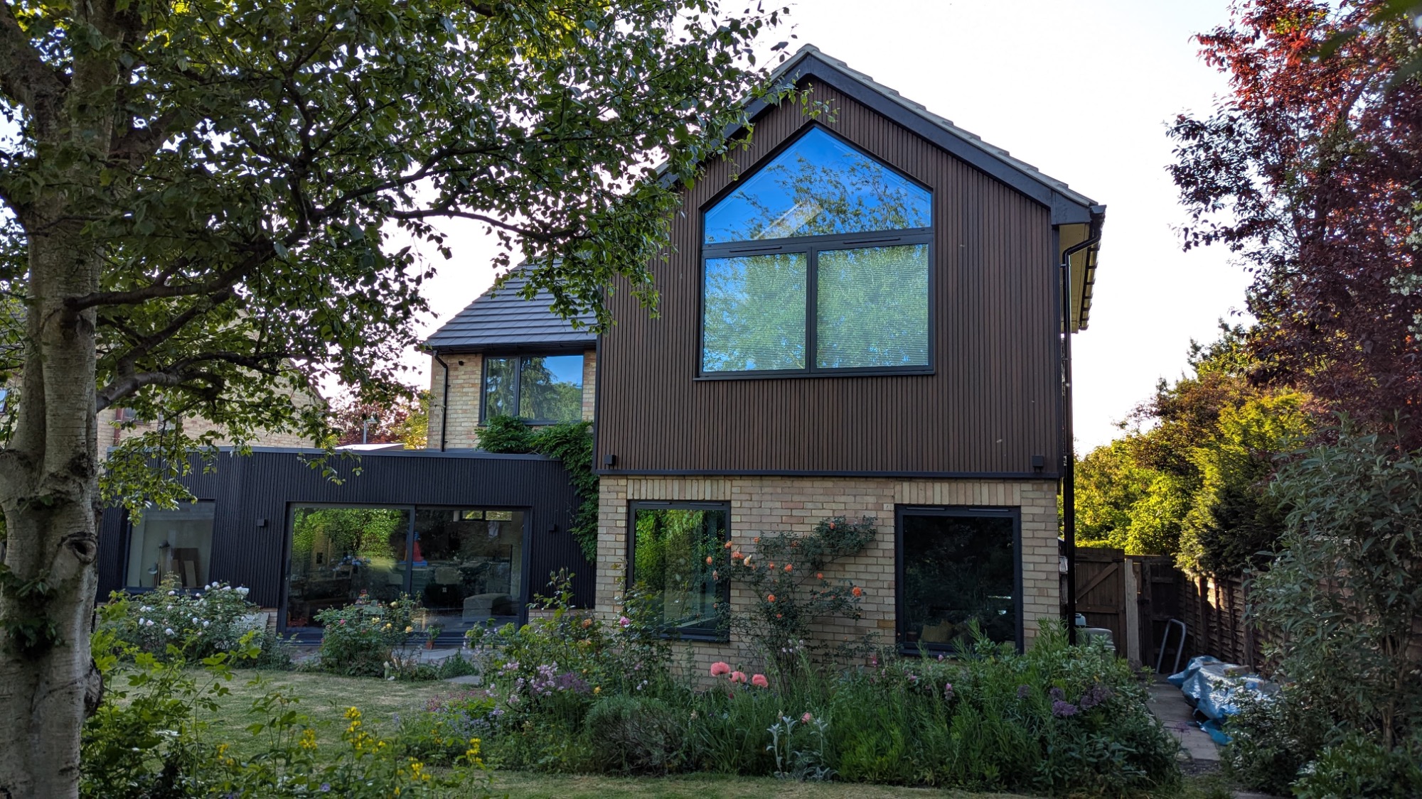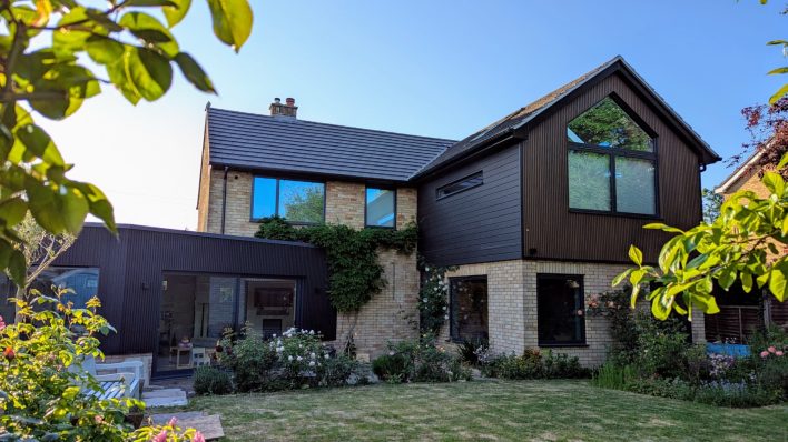 While the kitchen extension features just the vertical cladding, the two-storey extension features a combination of vertical and horizontal cladding,