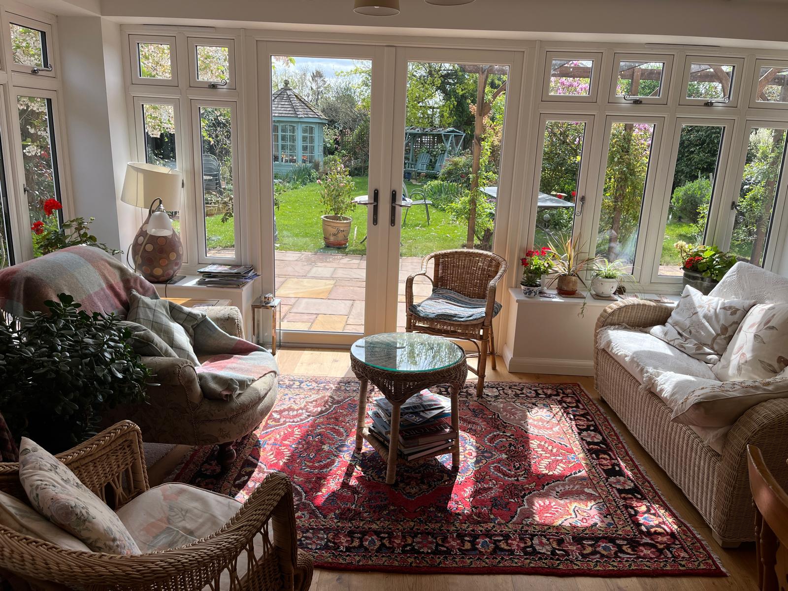 The living area opens directly onto a large patio, which is specifically designed to complement the homeowner’s keen interest in gardening.